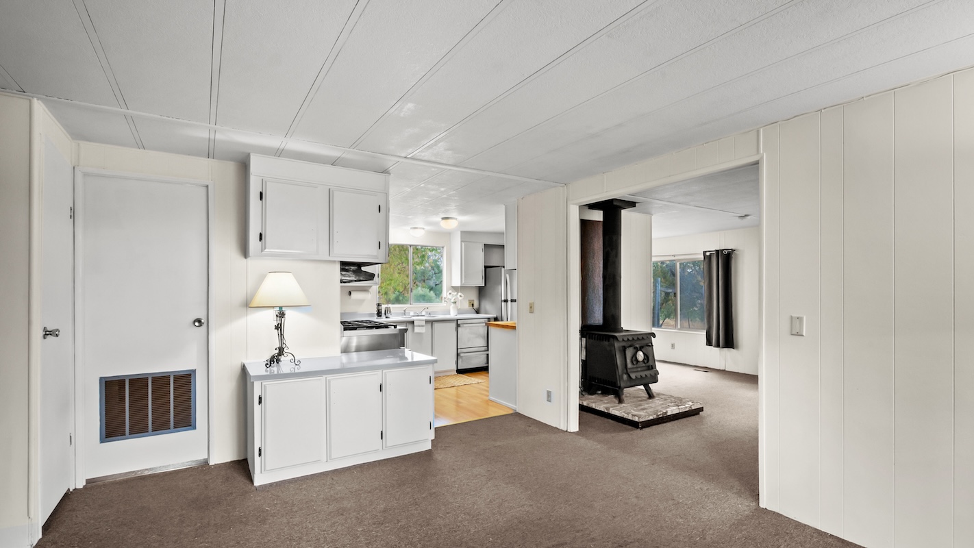 The home offers a welcoming front covered porch that invites morning coffee or evening stargazing. Inside, you’ll find a functional kitchen outfitted with stainless steel appliances (6-burner propane range, drawer dishwasher, large fridge). Comfort is assured via central heating and air conditioning, supplemented by a wood-burning stove for cozy ambiance. An indoor laundry area leads to a back deck—ideal for indoor-outdoor living and views across the meadow. A temperature-controlled outbuilding (30′ × 35′) sits nearby, perfect for a workshop, studio, or storage. For resilience, a Generac generator with dedicated propane ensures power during outages.