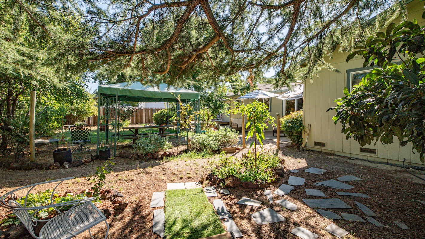 The interior features custom elements: granite kitchen counters, custom cabinetry, bamboo flooring throughout, a cozy wood-burning fireplace in the family room, and a jetted tub plus elegant vanity tops in the hall bath. The primary bedroom opens directly to the shady backyard, which includes raised beds, pollinator-friendly gardens, and meandering walkways among mature rose gardens and walnut orchard scenery.